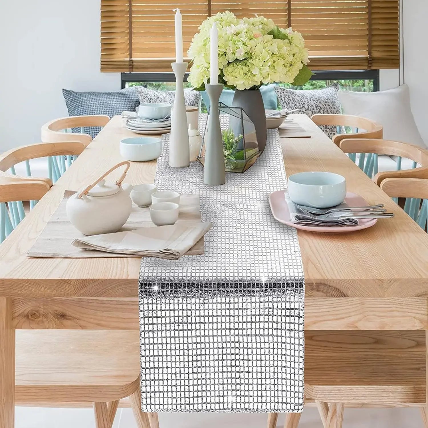 Superficie con Lentejuelas Brillantes: Decoraciones de mesa metálicas en plata con lentejuelas brillantes que reflejan la luz, aportando un toque exquisito y fácil de combinar con cualquier estilo de evento.